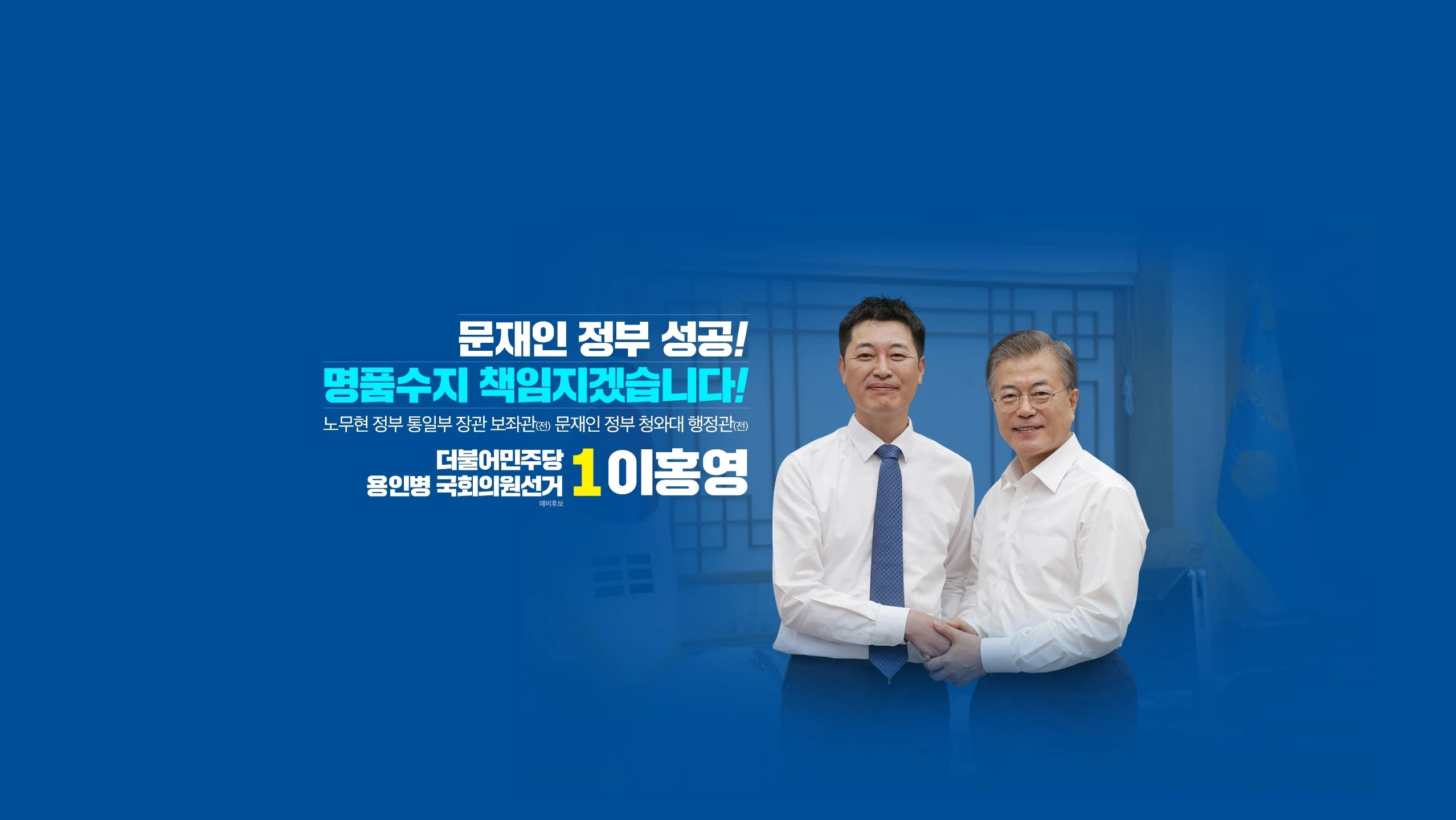 문재인 정부 성공! 명품수지 책임지겠습니다! 더불어민주당 용인병 국회의원선거 예비후보 1번 이홍영 노무현 정부 통일부 장관 보좌관(전), 문재인 정부 청와대 행정관(전)