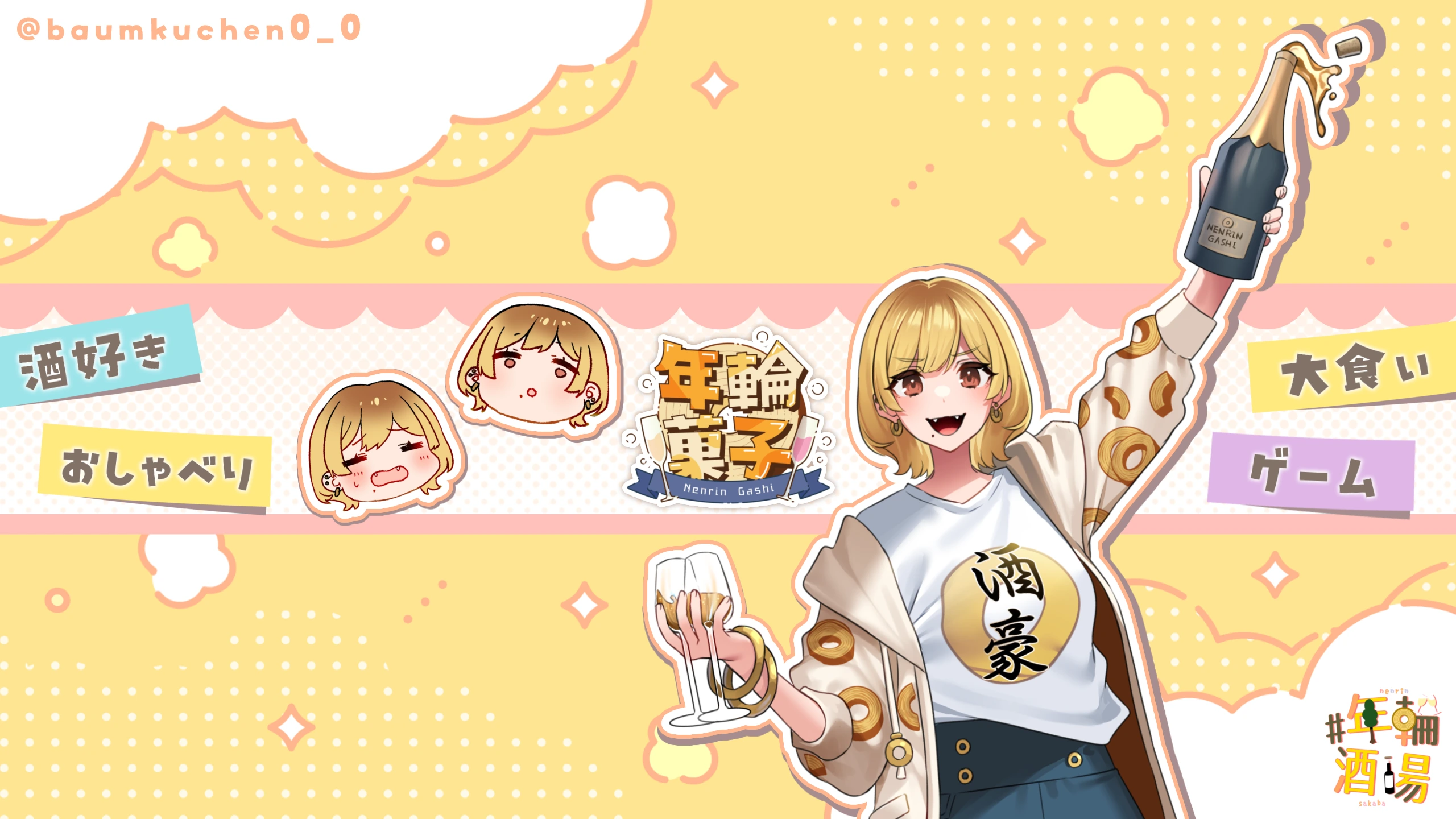 年輪菓子(ねんりんがし)=バームクーヘンの漢字化 やほまる〜🙌 お酒大好きおしゃべりガールだよ、よろしくねん💛 何"年"先もずっとここから笑顔の"輪"が広がってきますよーに🙏 大体22:00ぐらい配信開始で、飲酒・雑談メインで活動してるよ!! ⚠️活動についての全ての画像の無断転載・AI学習を禁止します⚠️ 【X(Twitter)タグ @baumkuchen0_0】 ファンマーク:🍾🌳 ファンネーム:#年輪友達 ファンアート:#年輪絵師 スケベアート:#年輪指定 エゴサ用:#年輪目撃 配信:#年輪酒場 【クレジット X(Twitter)】 所属グループ:MELTY TONE @meltytone ママ:赤城くらげ @akagi_huyu ネームロゴ:モンブラン @MontBlanc04 OP・ED:のすけ @NoNoNoSuKeGnR 配信背景:羽零 @urei_kaonasi メンバーシップ絵文字:Urukun @Uru_oxo