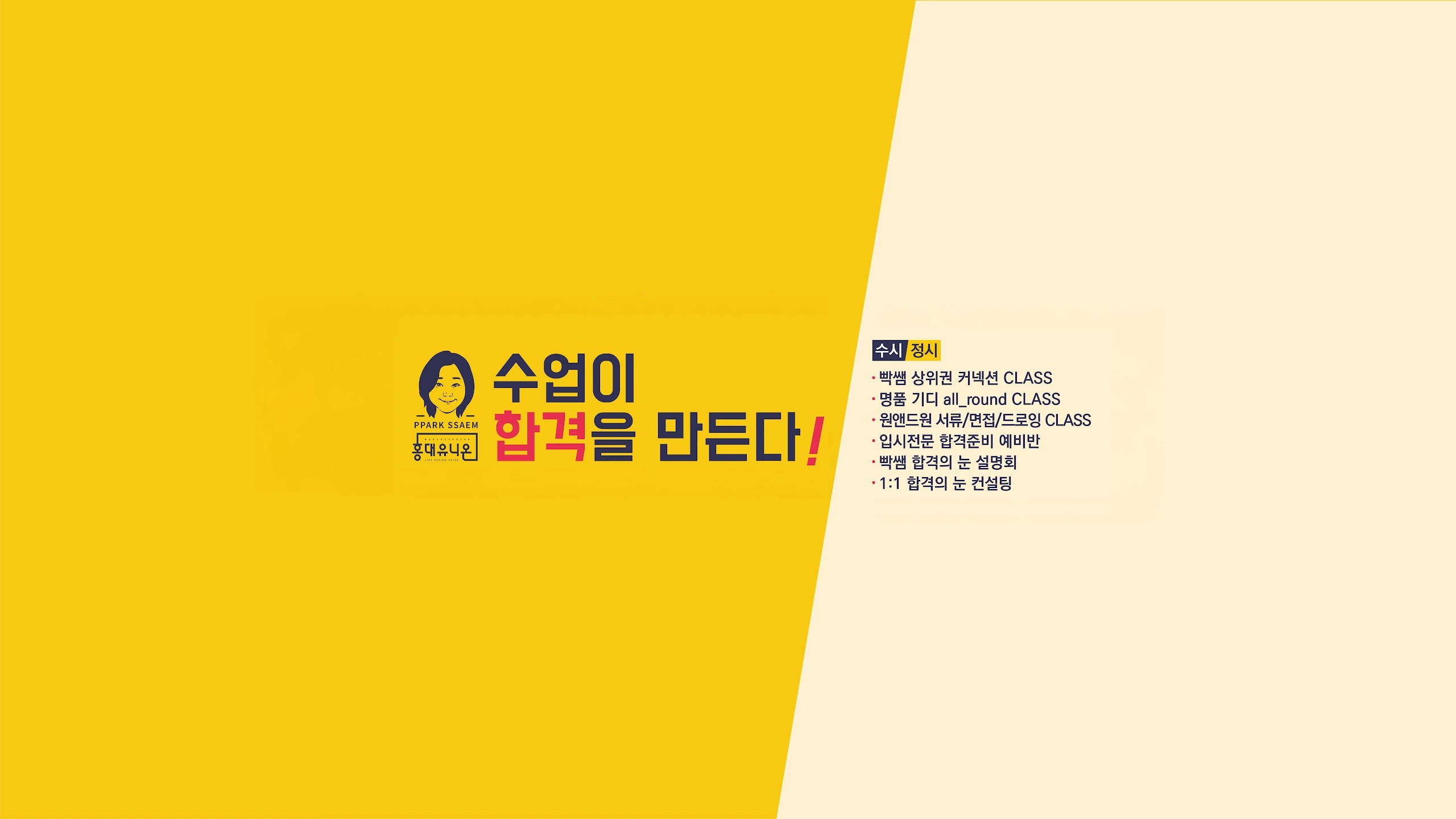 안녕하세요, 미대입시 합격에 진심인 홍대유니온 빡쌤 박경미원장입니다. 홍대유니온은 입시 디자인 전문 학원으로 2005년부터 지금까지 홍대 앞 같은 자리에서 학생들의 합격과 함께 해왔습니다. 특히 빡쌤과 홍대유니온 티쳐스들은 학생들이 대학합격이라는 청년시절의 절대적인 꿈을 이루기 위해 홍대유니온을 선택함으로써 배우고 느끼고, 깨닫고 발전하여 한 명이라도 더 합격할 수 있도록 대학별 합격 수업시스템을 만들어가고 있습니다. 홍대유니온에서는 붙을 수 없었던 학생이 합격을 하고, 예비합격인 학생이 최초합격을 하고, 합격이 가능한 학생이 더 좋은 학교에 합격을 하며, 학교에서 가장 우수한 장학합격이 되는 일들이...우리 홍대유니온에서 함께 노력하고 배우는 학생들에게 해마다 일어나고 있는 결과입니다. 특히 홍대유니온 유튜브는 "학생들의 합격에 진심"인 수업의 과정과 결과를 보여드리고 있습니다. 아이들의 인내와 노력의 가치가 훌륭한 결과가 되고 그 결과를 만들어내는 여러 과정의 컨텐츠들을
