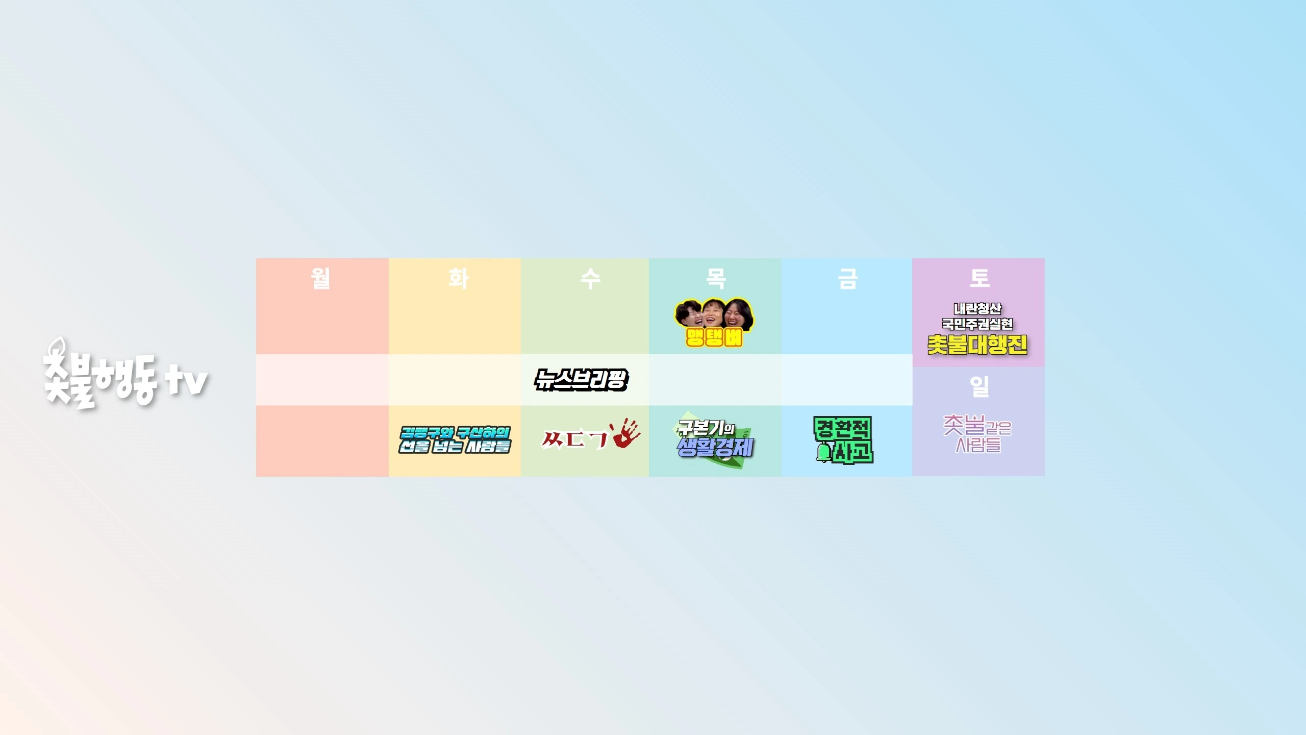 촛불행동 공식 유튜브입니다. 촛불민심을 담아내는 방송과 영상을 만들고 있습니다. 촛불행동tv에 더 많은 지지와 응원을 부탁드립니다. 방송 일정ㅣ - 월: 오후 12시 아무튼 촛불 - 화: 오후 12시 아무튼 촛불+선을 넘는 사람들 - 수: 오후 12시 아무튼 촛불 / 1시 백자-김태형의 ㅆㄷㄱ - 목: 오후 12시 아무튼 촛불+구본기의 생활경제 / 오후 5시 맹탱벼 - 금: 오후 12시 아무튼 촛불+경환적 사고 - 토: 오후 4시 촛불대행진 생중계 - 일: 오후 5시 촛불같은 사람들 촛불행동tv | 신한은행 100-037-661437 촛불승리전환행동 멤버십 가입하기 https://bit.ly/candleact_tv 촛불대행진 후원 | 신한은행 100-036-551308 | 촛불승리전환행동 페이팔 paypal.me/candlemove ARS 060-707-3300(한 통에 10,000원 후원) 촛불행동 회원가입 https://cmsagree3.npas.co.kr
