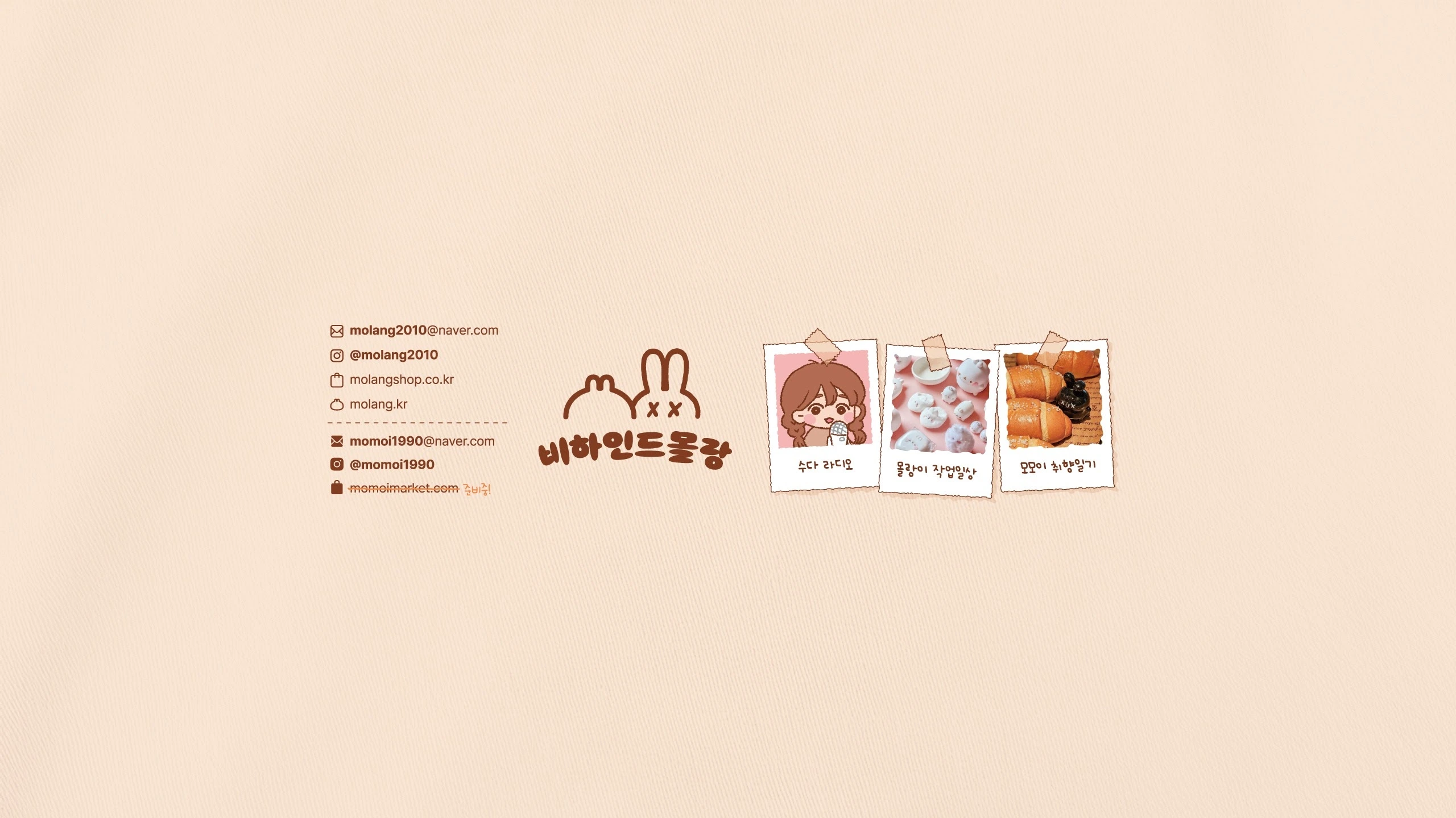안녕하세요 몰랑이 작가 일상채널입니당 몰랑이를 만들면서 일어나는 작은 일상들을 소소하게 기록하는 공간입니다. 상업적 문의는 이메일로 보내주세요! :) [email protected] ● 인스타그램 : [ @molang2010 ] https://www.instagram.com/molang2010/ ● 트위터 : [ @molang2010 ] https://twitter.com/molang2010 ● [몰랑이 온라인샵] www.molangshop.co.kr