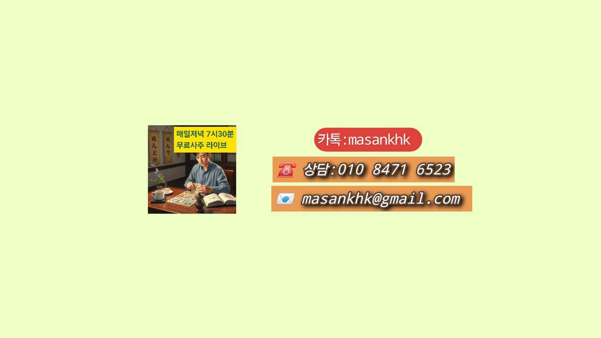 민수사주 설명 안녕하세요? 민수명리학당 대표 민수입니다. 창원에서 명리로 실전 사주풀이 공부방을 운영하며 카카오톡으로 실전 명리를 지도하고 있습니다. * 사주상담 문의: 카톡 masankhk, 010 8471 6523으로 연락주세요. * 상담비용: 1인 5만원 궁합10만원 계좌 경남670 22 0149367 김*규 *유료상담은 문자로 생년월일시를 보내주시고 시간을 정해서 상담을 진행합니다. 풀리지 않는 인생의 고민을 민수와 함께 풀어보시길 권합니다. *심리상담사1급(2022-002420 *명리 심리상담사 1급 (2022-000887) 메일:[email protected] [email protected]